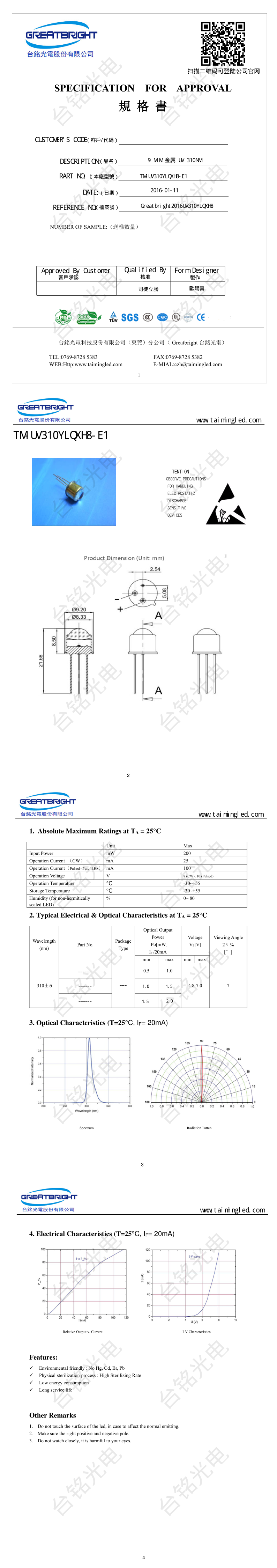 台铭公司深紫外线杀菌led 275nm-285nm 台湾制程, 可替代254nm汞灯,光功率可达0.5-2.0mw,7度角度为3-6mW均采用平面石英玻璃封装,使用电流20MA。